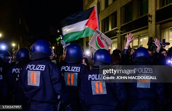 German riot police officers push back Pro-Palestinian demonstrators as they protest against the bombing in Gaza outside the Foreign Ministry in Berlin on October 18, 2023. (Photo by John MACDOUGALL / AFP) (Photo by JOHN MACDOUGALL/AFP via Getty Images)