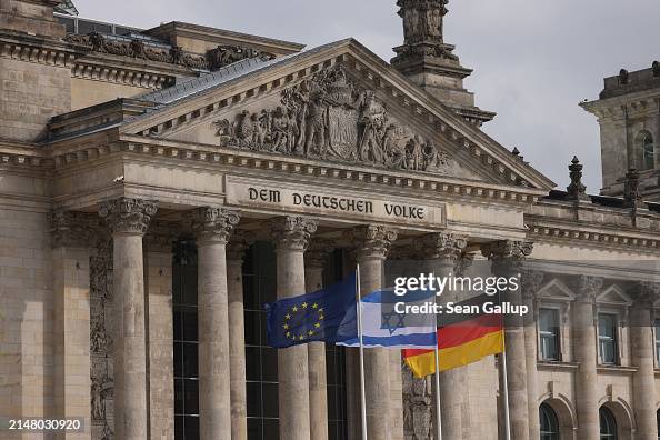BERLIN, GERMANY – APRIL 09: The Israeli flag flies between the European Union and German flags outside the Reichstag on April 09, 2024 in Berlin, Germany. (Photo by Sean Gallup/Getty Images)