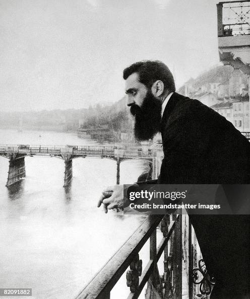 UNSPECIFIED – CIRCA 1897: Theodor Herzl at the balcony of the hotel in Basel where he stayed during the Zionist congress overlooking the Rhine river, Switzerland, Photograph, 1897 (Photo by Imagno/Getty Images)