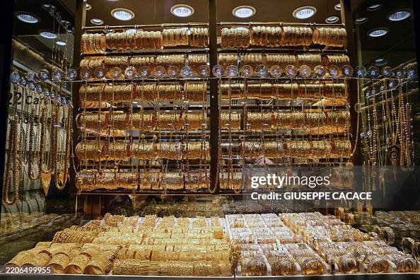 This picture shows the shop window of a jewelry store in Dubai on March 10, 2025. Sudan’s gold industry is booming thanks to Emirati financing, but instead of helping end the war, it is fuelling it by enriching both the army and paramilitaries, according to official and NGO data. Demand for the country’s massive gold reserves is „a key factor in prolonging the war,“ Sudanese economist Abdelazim al-Amawy told AFP. (Photo by Giuseppe CACACE / AFP) (Photo by GIUSEPPE CACACE/AFP via Getty Images)
